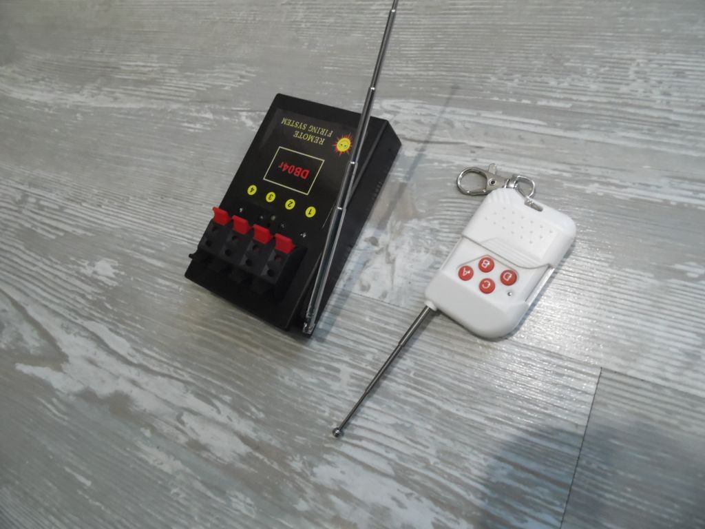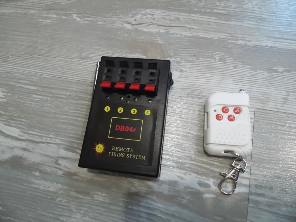 Дистанционный запуск фейерверка. Возможно запустить 4 изделия. Элементы питания- АА 4 шт. В передатчике- батарейка 12в. Радиус примерно 100м.